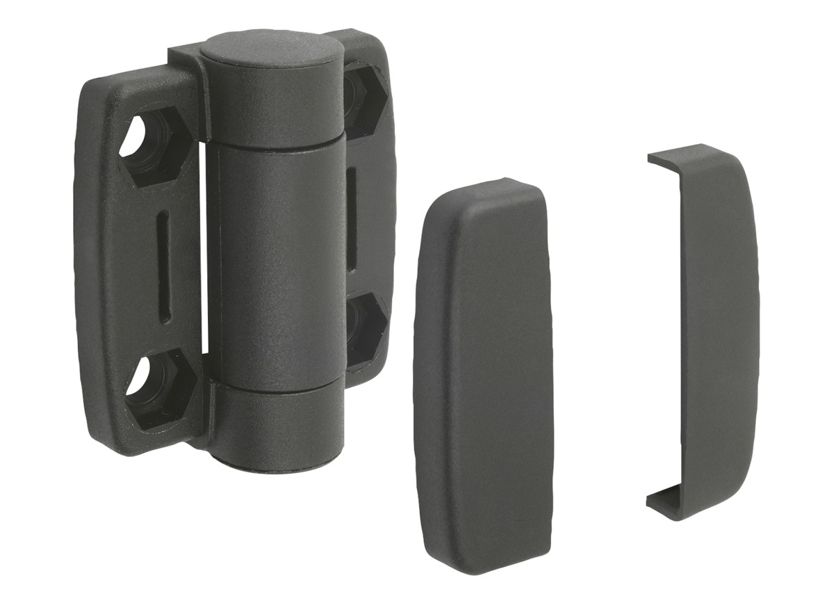 Hinge and caps, fibreglass reinforced PA thermoplastic.