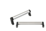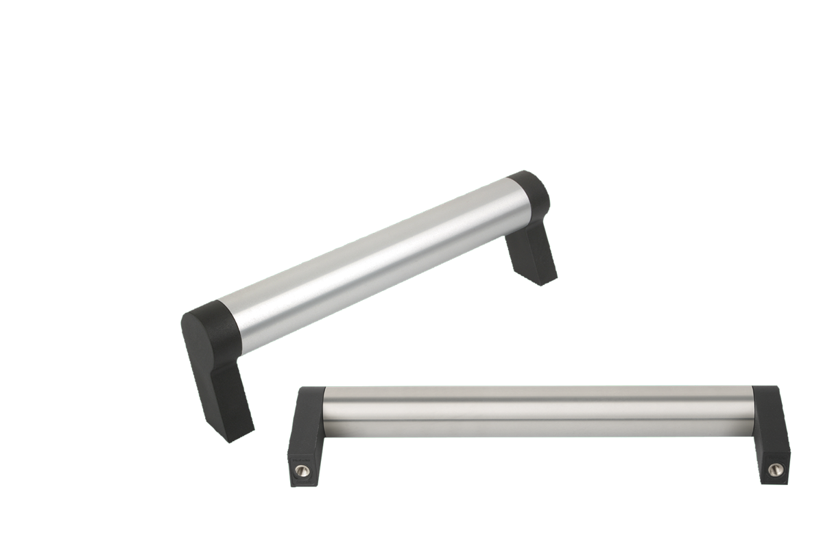 Oblique tubular pull handles in modern industrial design. Webs on the leg spigot provide a precision fit for the tube.