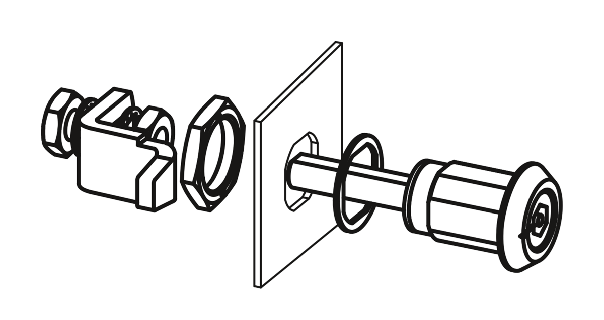 Turning the actuator 90° brings the tongue into the closed position. Turning the actuator another 90° draws the tongue into the frame increasing the pressure. The compression gap is 6 mm. The fastening nut is an earthing nut with teeth one side. The offset tongue can be installed positive or negative.