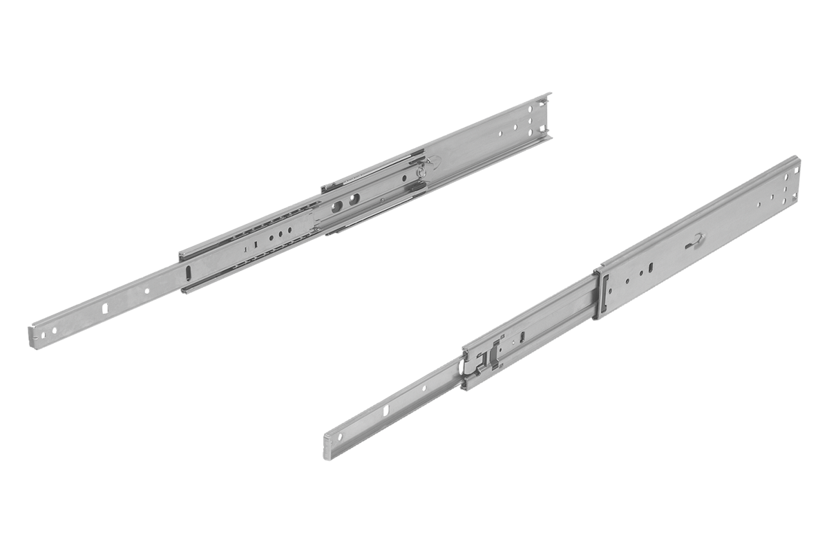 En los carriles telescópicos con sobre extensión, la carrera es mayor que la longitud de montaje. Enclavamiento en posición abierta. Accionando la palanca de desbloqueo se puede extraer fácilmente el cajón y retirarlo de la guía.