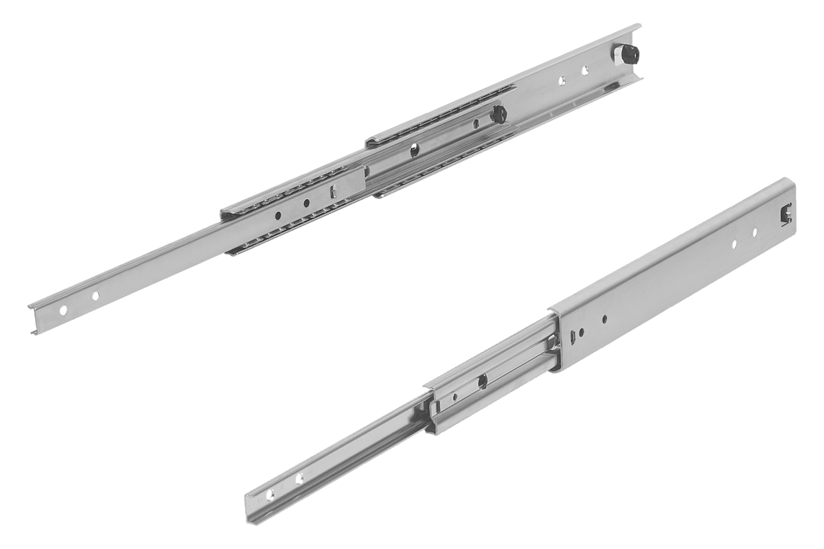 En los carriles telescópicos con sobre extensión, la carrera es mayor que la longitud de montaje. Enclavamiento en la posición cerrada. La capacidad de carga dinámica de los carriles telescópicos indica la capacidad de carga máxima de un par de carriles telescópicos montados en vertical cuando se utiliza el recorrido de extensión completo. Las capacidades de carga indicadas se han determinado con una distancia entre carriles de 450 mm y se refieren al valor máximo con 10.000 y/o 80.000 ciclos.