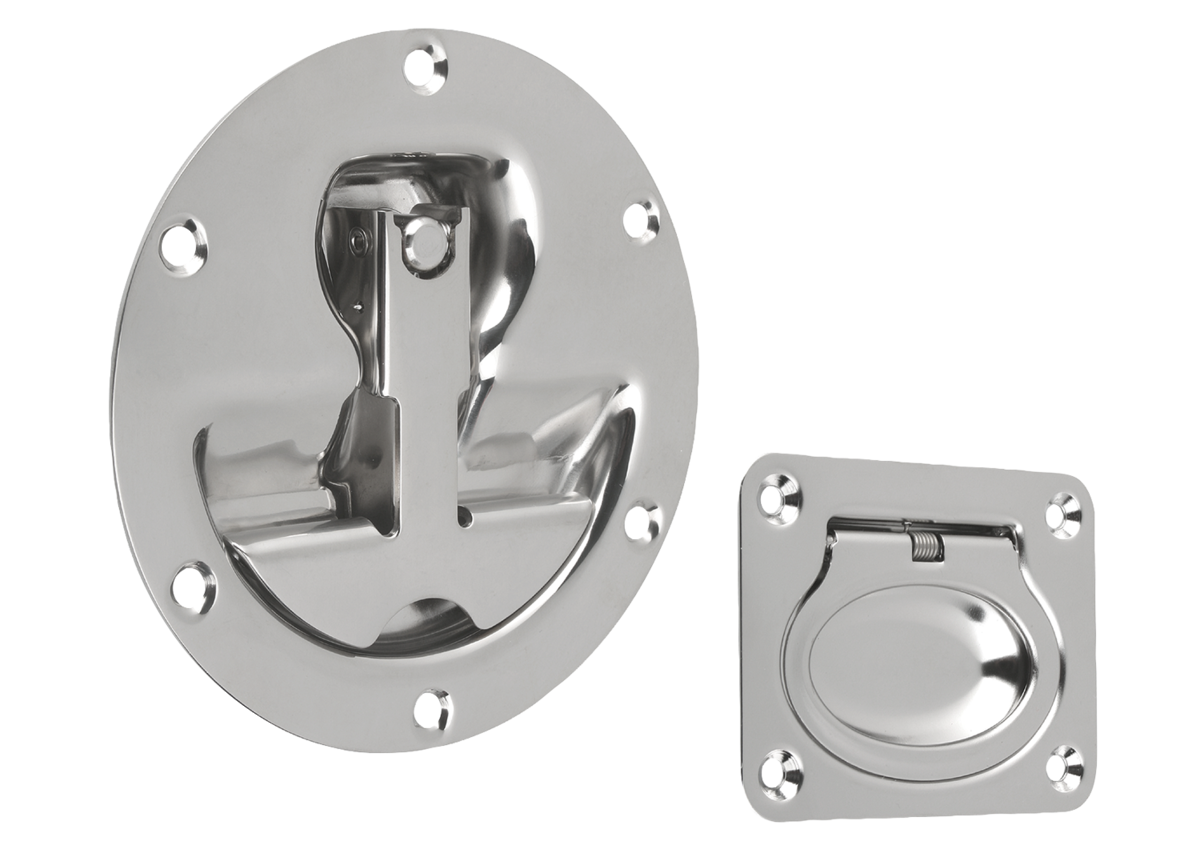 Empuñaduras abatibles de acero inoxidable con poca profundidad de montaje. Para placas de montaje y suelo o cajones. Con muelle de retroceso. Tras el accionamiento, la empuñadura gira automáticamente para colocarse en posición de reposo.