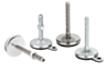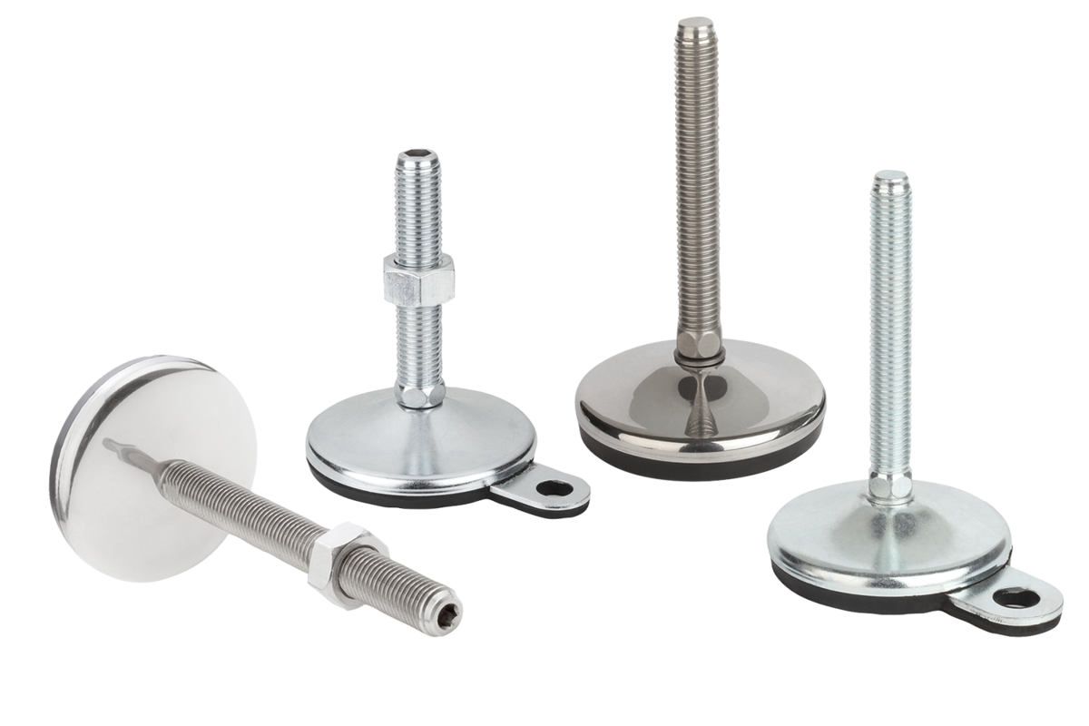 Pies regulables de acero o acero inoxidable con husillo roscado de alojamiento giratorio y superficie de apoyo de goma. El soporte de goma macizo está firmemente unido al disco de chapa mediante vulcanización. El soporte de goma tiene una adherencia excelente. Posee propiedades aislantes contra el ruido estructural y obstaculiza la transmisión de oscilaciones y golpes contra el suelo.