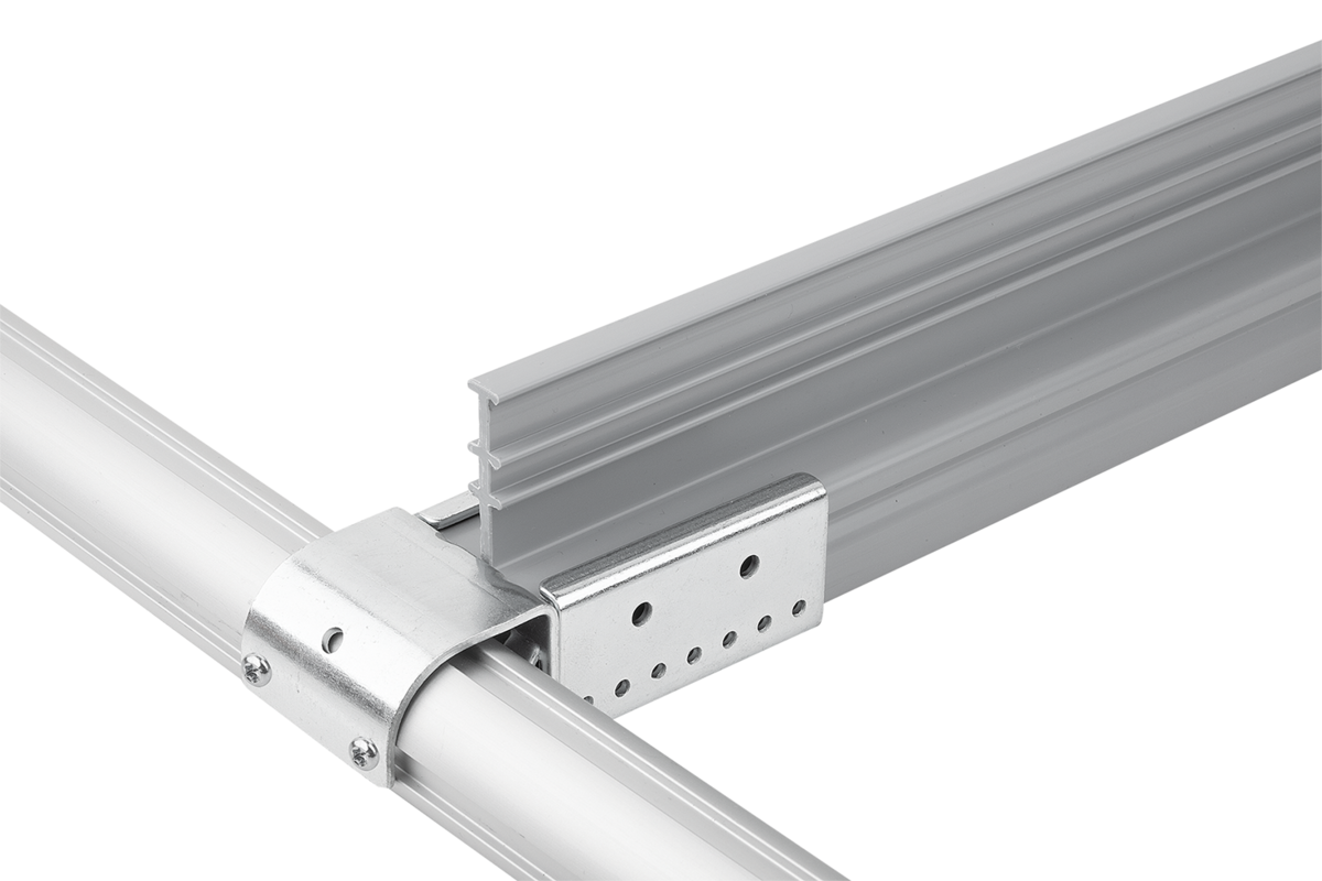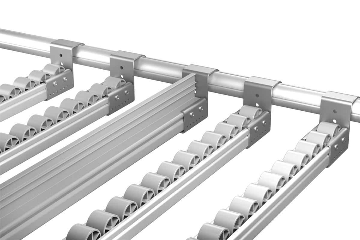 Con los carriles guía, el producto transportado se mantiene de forma segura en la pista de rodillos. Para el montaje, los carriles guía simplemente se introducen en el soporte de enganche o el soporte de montaje.