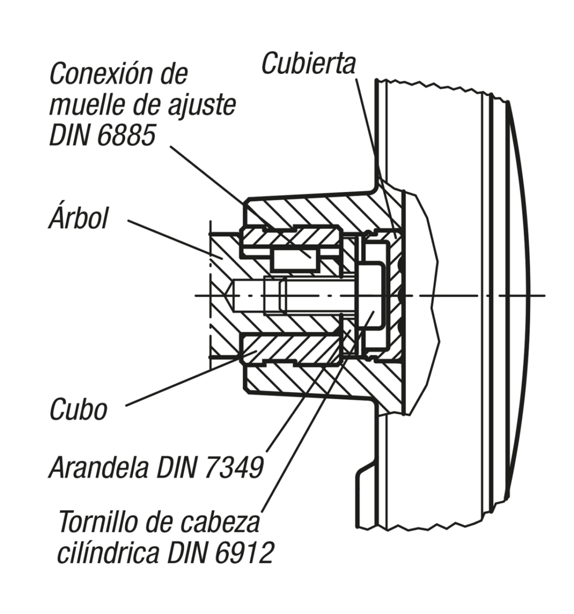 La tapa del cubo se suministra sin montar. Los volantes se tienen que asegurar axialmente o fijar mediante un tornillo de cabeza cilíndrica DIN 6912 y una arandela DIN 7349 mediante la conexión del chavetero en el árbol.