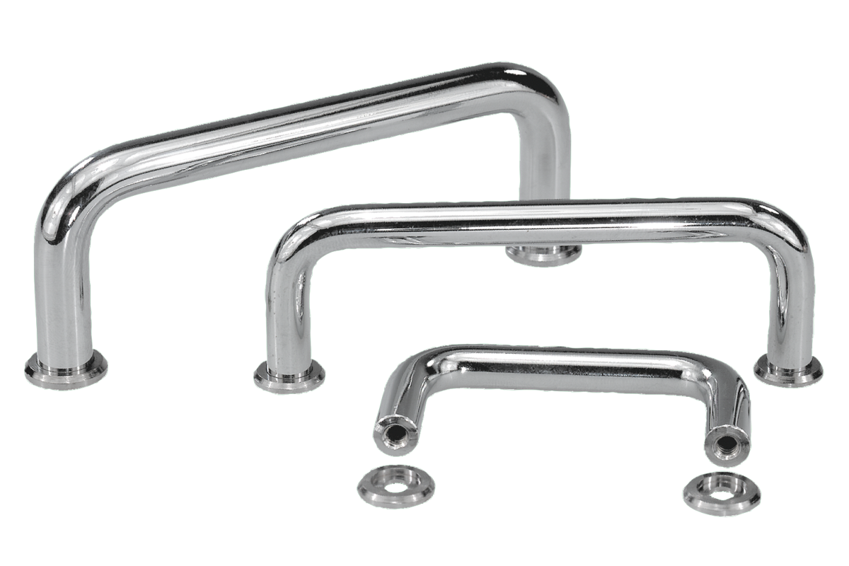 Estas empuñaduras curvas se utilizan principalmente en aparatos ópticos, laboratorios, equipos de audio, vídeo, HiFi, etc. Las arandelas de apoyo se suministran sueltas.
