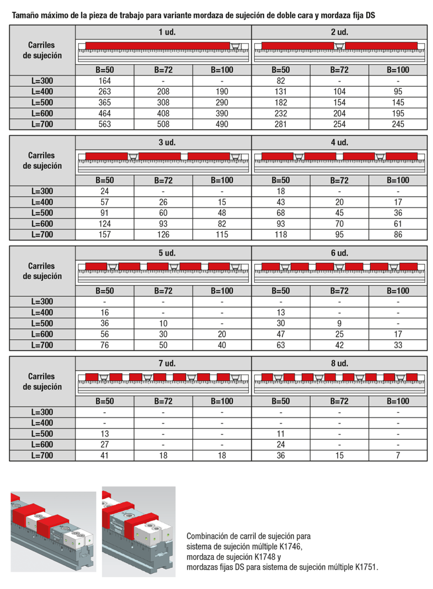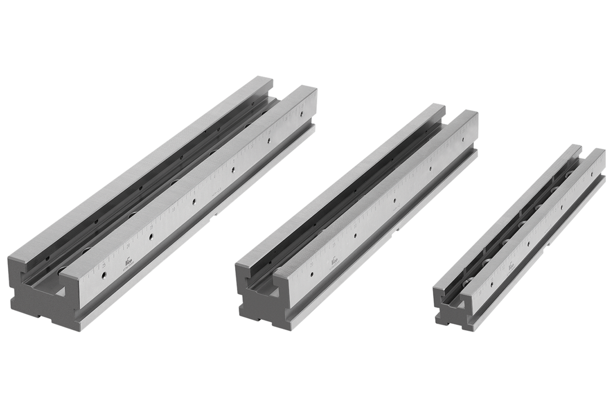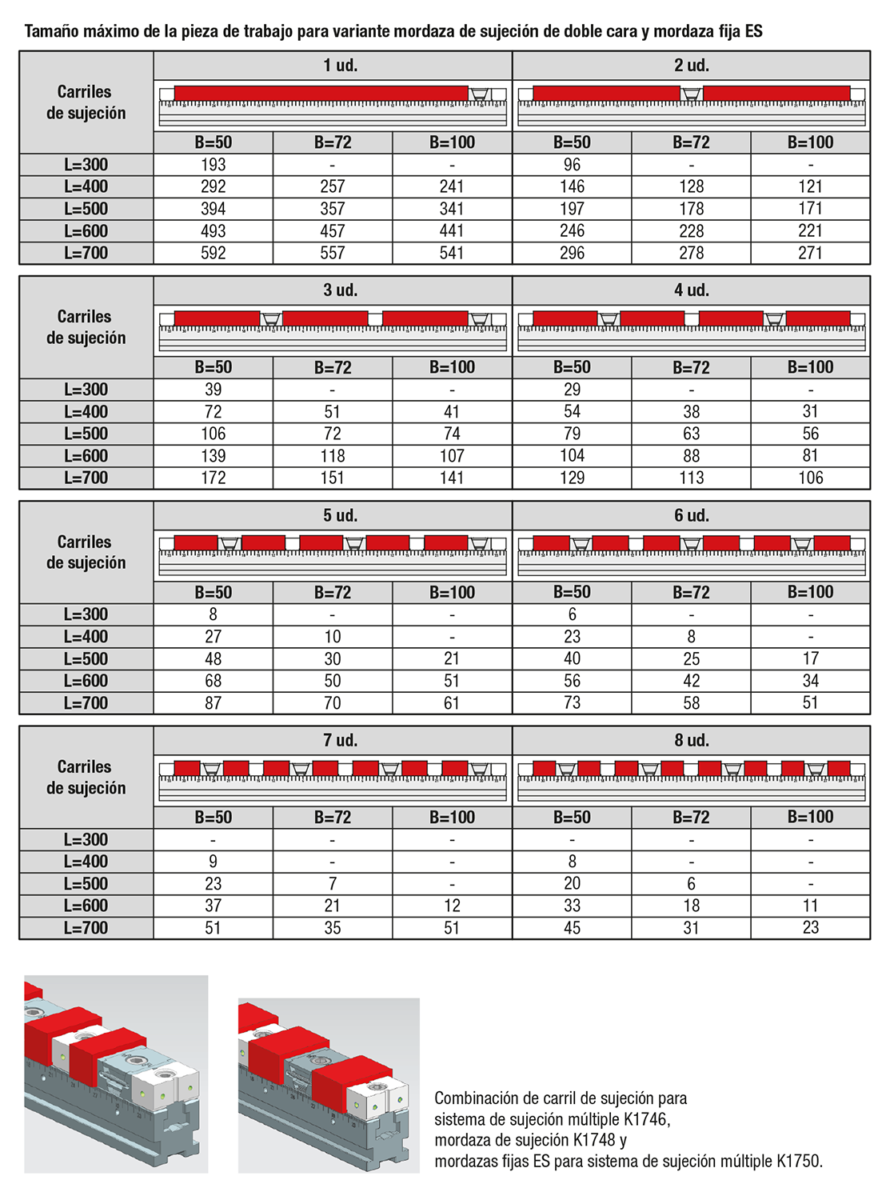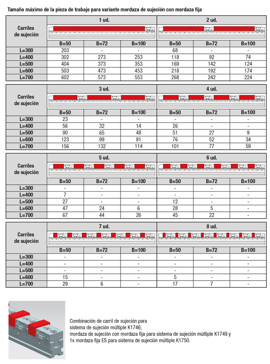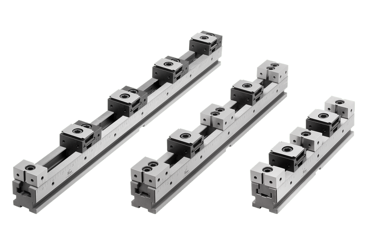 Pueden montarse de forma sucesiva o yuxtapuestos varios carriles de sujeción de longitud distinta. Mediante el engranaje de precisión es posible posicionar de manera muy precisa las mordazas de sujeción. Con la graduación lateral de los carriles de sujeción se puede registrar cualquier posición de las mordazas de sujeción y ajustar de forma idéntica en caso de repetición. En las perforaciones roscadas pueden montarse topes.