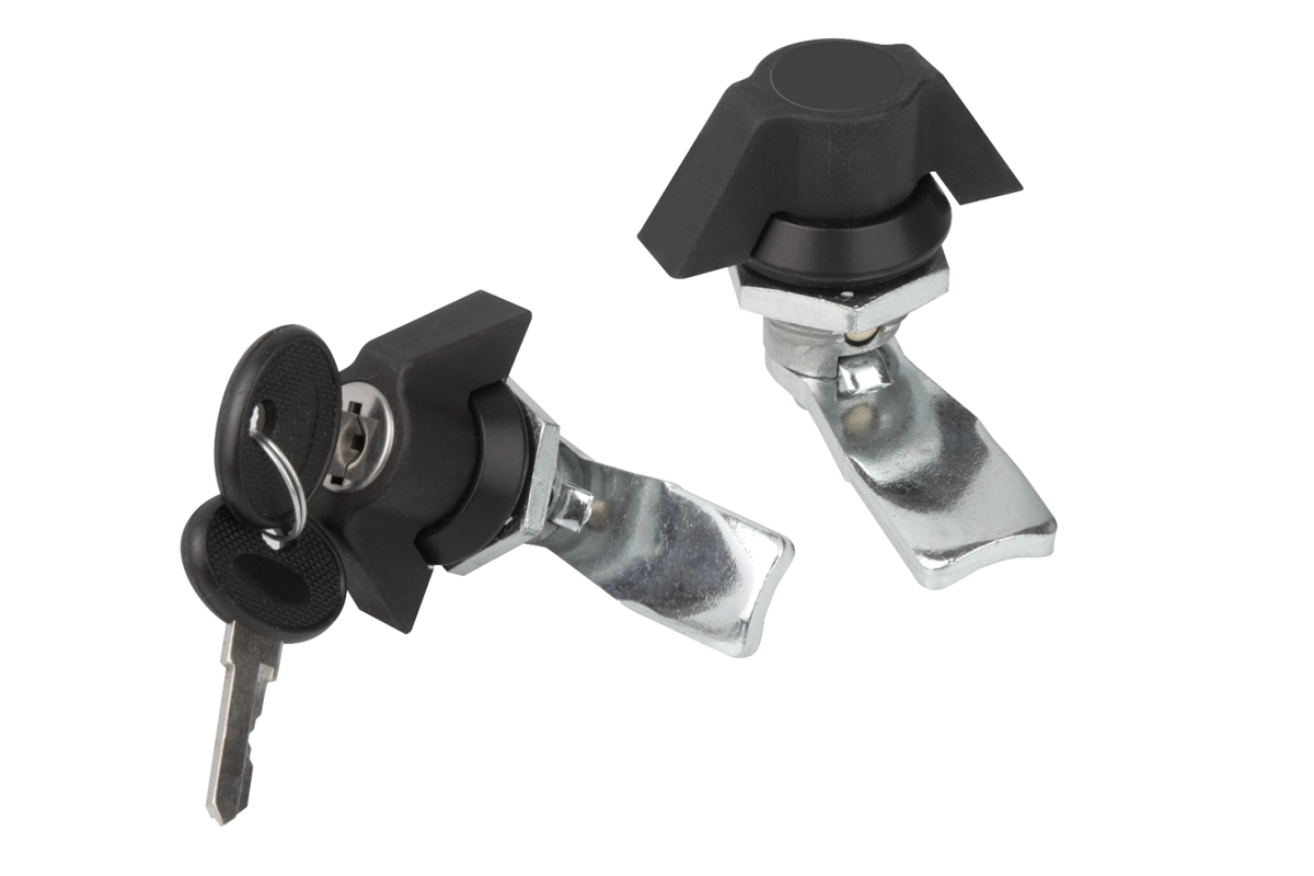 Fecho lingueta com manípulo de comando. Pode ser utilizada à direita ou à esquerda com curso de fechamento de 90°. O fecho lingueta pode ser instalada pré-montada. A porca de fixação é adicionada unilateralmente como porca de aterramento com garras.