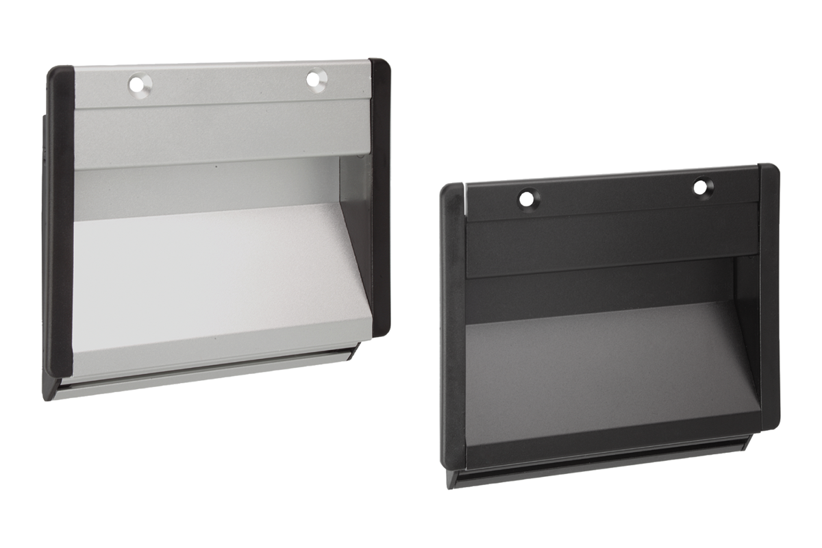 Concha embutida tratada com shot peening, acetinada e anodizada na cor preta ou em cores naturais. Perfil de borracha preto. Parafusos de fixação zincados.
