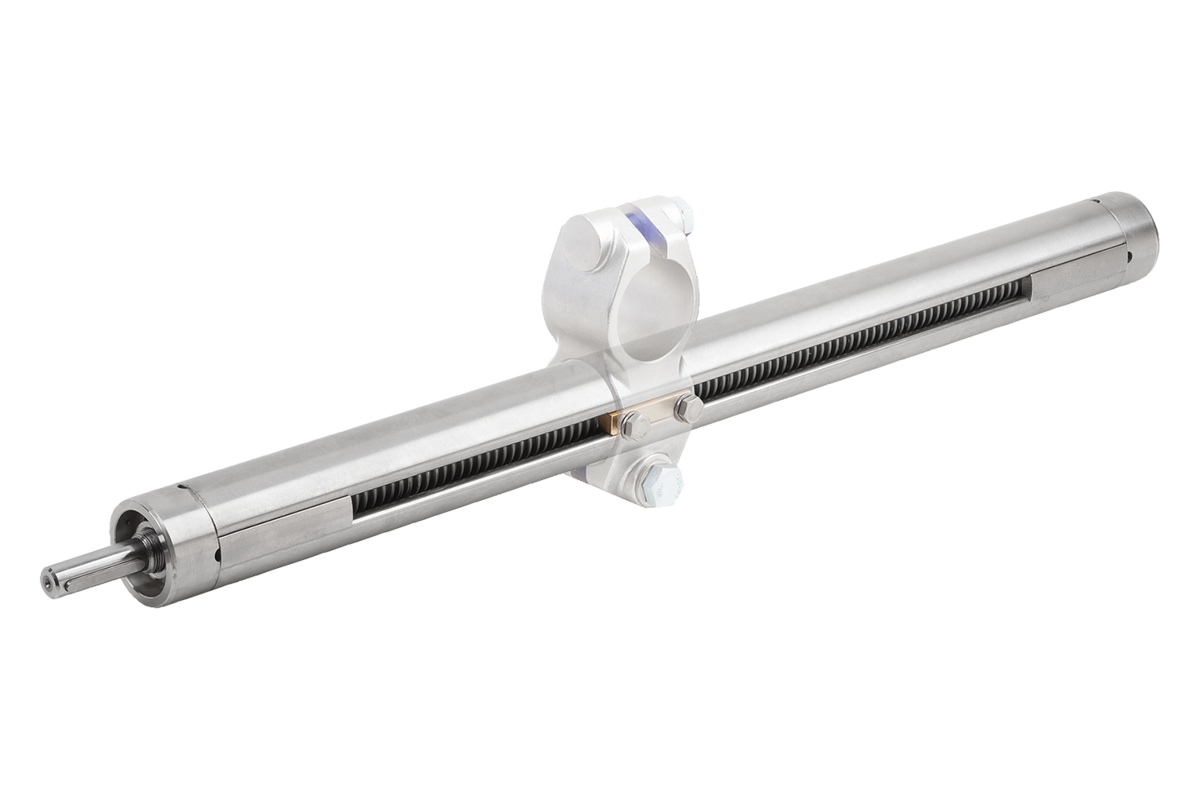 Um movimento de rotação do fuso roscado é convertido em um movimento de saída linear do carro deslizador.