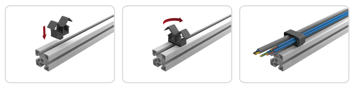 A montagem é efetuada através de um elemento de fixação em T embutido no suporte, o qual será inserido na ranhura do perfil e fixado com uma rotação de 90°. A fixação dos cabos ocorre através do O-Ring fixado.